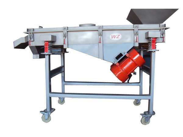 WZSF系列直線振動篩采用雙振動電機驅動,當兩臺振動電機做同步、反向旋轉時,其偏心塊所產生的激振力在平行于電機軸線的方向相互抵消,在垂直于電機軸的方向疊為一合力,因此篩機的運動軌跡為一直線。其兩電機軸相對篩面有一傾角,在激振力和物料自重力的合力作用下,物料在篩面上被拋起跳躍式向前作直線運動,從而達到對物料進行篩選和分級的目的。可用于流水線中實現自動化作業。具有能耗低、效率高、結構簡單、易維修、全封閉結構無粉塵溢散的特點。最高篩分目數400目,可篩分出7種不同粒度的物料。