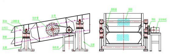 該系列篩機為座式安裝。篩面傾角的調整可通過改變彈簧支座位置高度來實現。